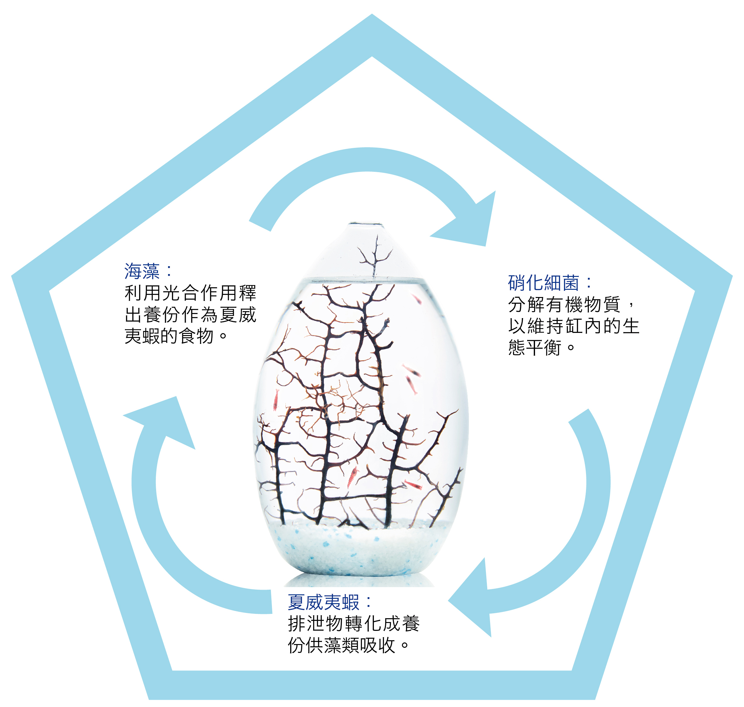 由於MOANA的生態系統進行完美性迴圈,所以不用喂食,小蝦也能存活。牠們以海樹枝和容器上附著的藻類作為食物。砂石裡繁殖的細菌能分解小蝦的排泄物,生成有助於藻類生長的營養成分。由藻類把小蝦呼出的二氧化碳和光結合,進行光合作用,提供水中的氧氣。